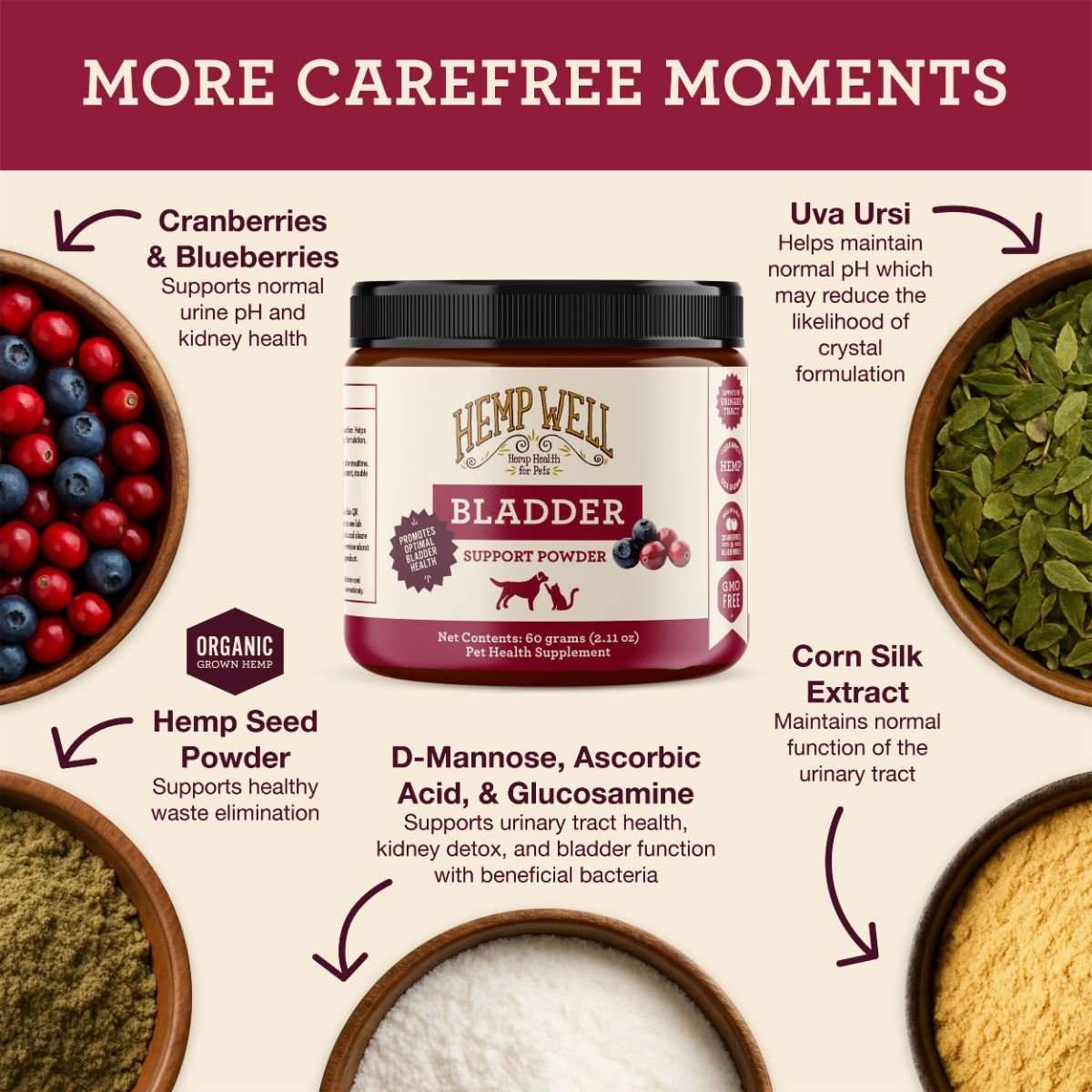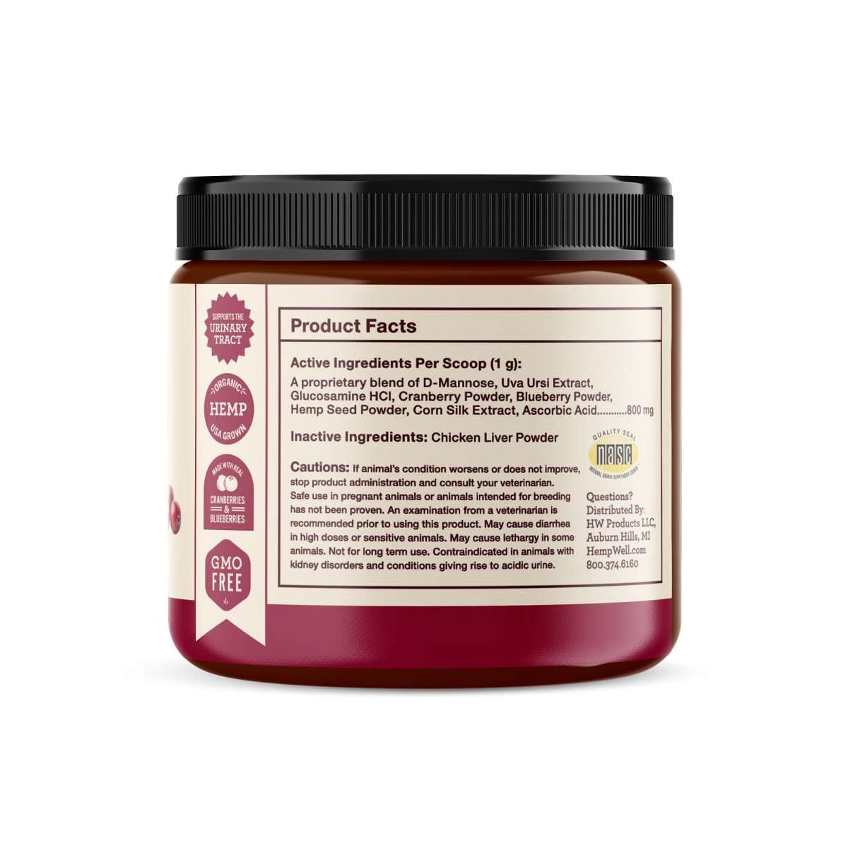 Give your pet the gift of better bladder health with Hemp Well Bladder Support Powder — a NASC-certified, veterinarian-formulated supplement made with cranberries, D-mannose, corn silk extract, uva ursi, glucosamine, ascorbic acid, and hemp seed powder.