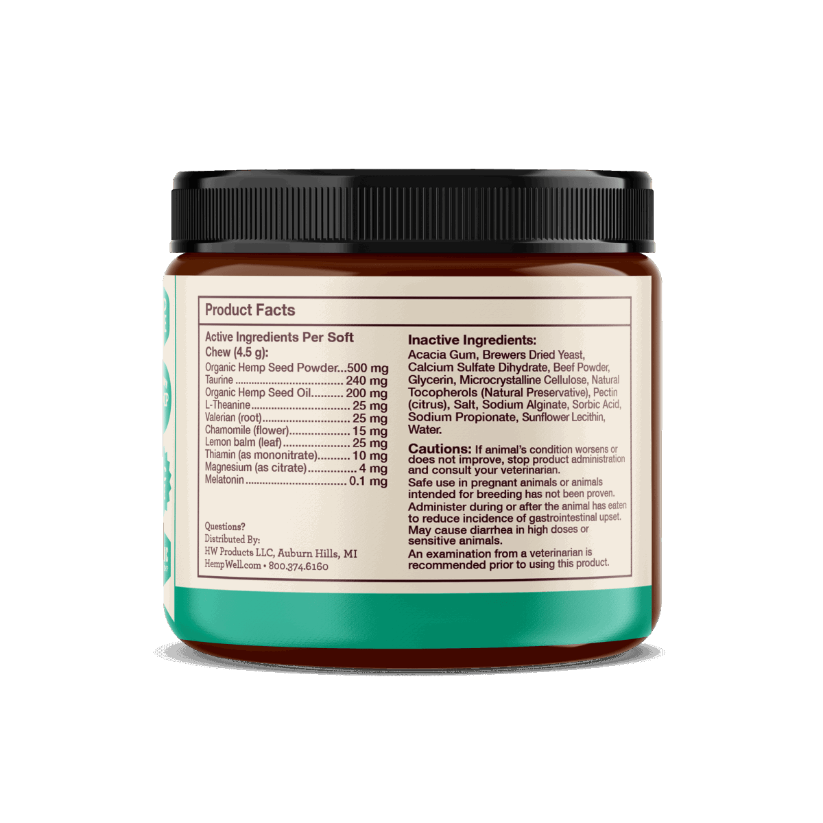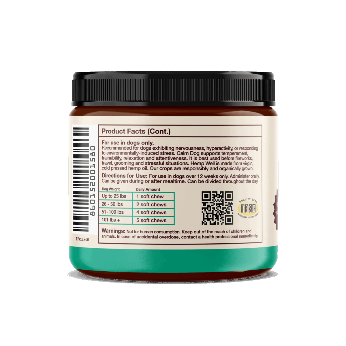 Hemp contains cannabinoids that interact with the endocannabinoid system in your dog’s body, regulating stress, mood, and anxiety. Supporting this system promotes calm and balance. Calm dog also includes organic ingredients like chamomile, melatonin, and lemon balm