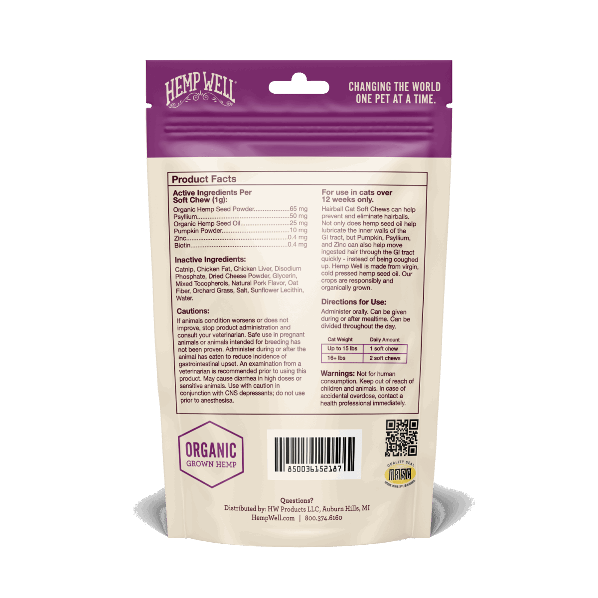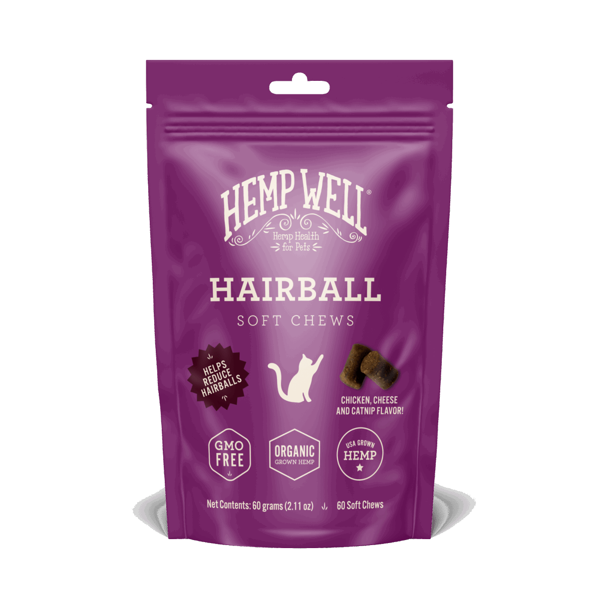 Hairballs are a common struggle for indoor and long-haired cats, but they don’t have to be. Hemp Well Cat Hairball Soft Chews are formulated with organic hemp seed powder, pumpkin seed, and psyllium fiber to help hair pass smoothly through the digestive tract and reduce the formation of hairballs.