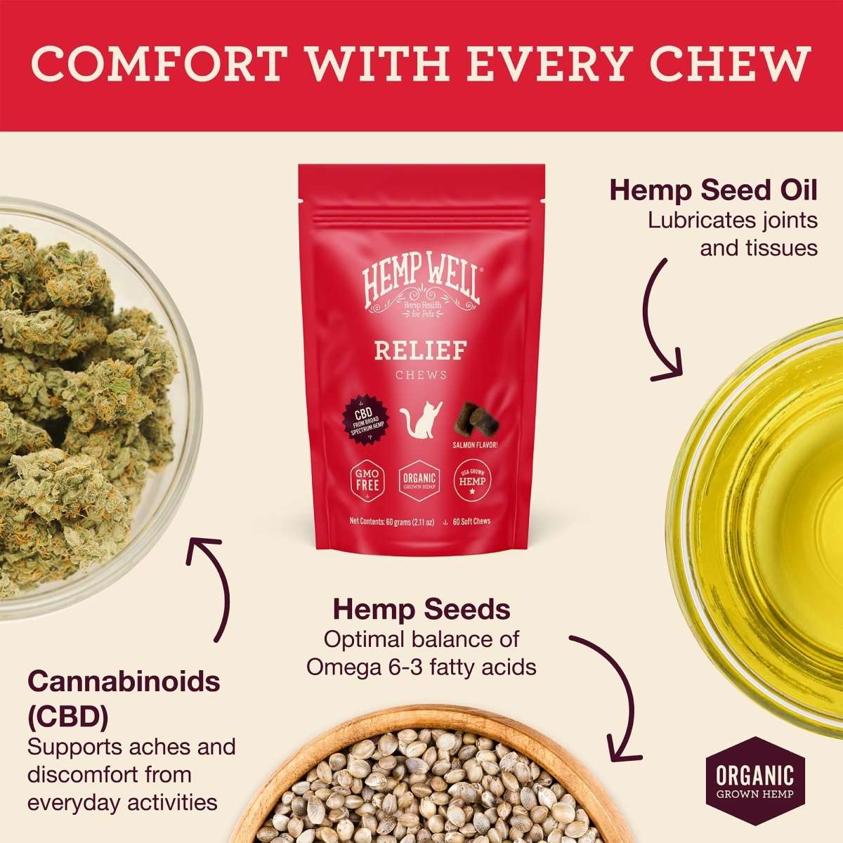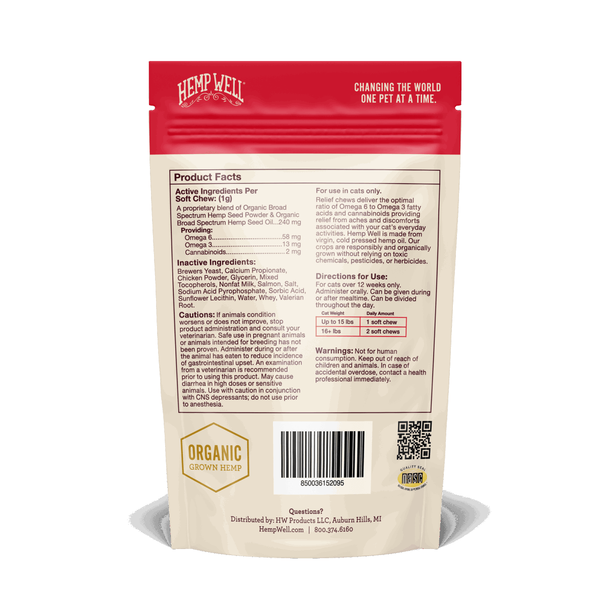 Some Hemp Well products contain naturally occurring CBD from hemp, while others use only nutrient-rich hemp seed oil. Each product label clearly states its ingredients so pet parents can choose what’s right for their pet’s needs. Our Relief line (the red label) typically will indicate CBD.