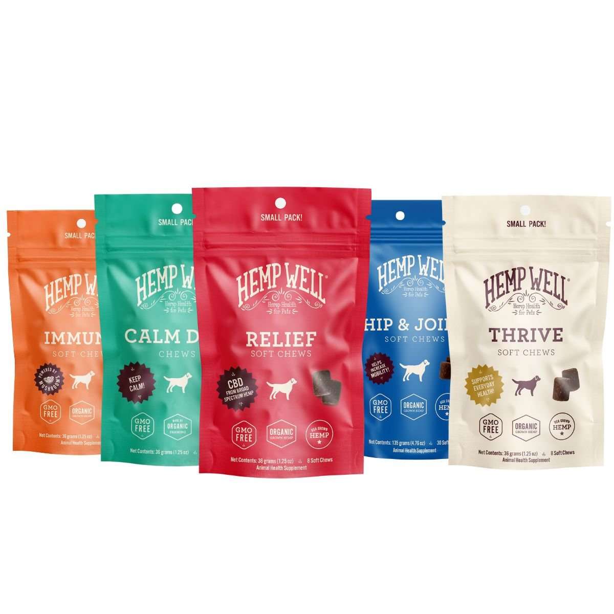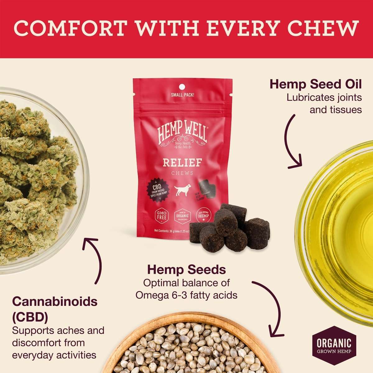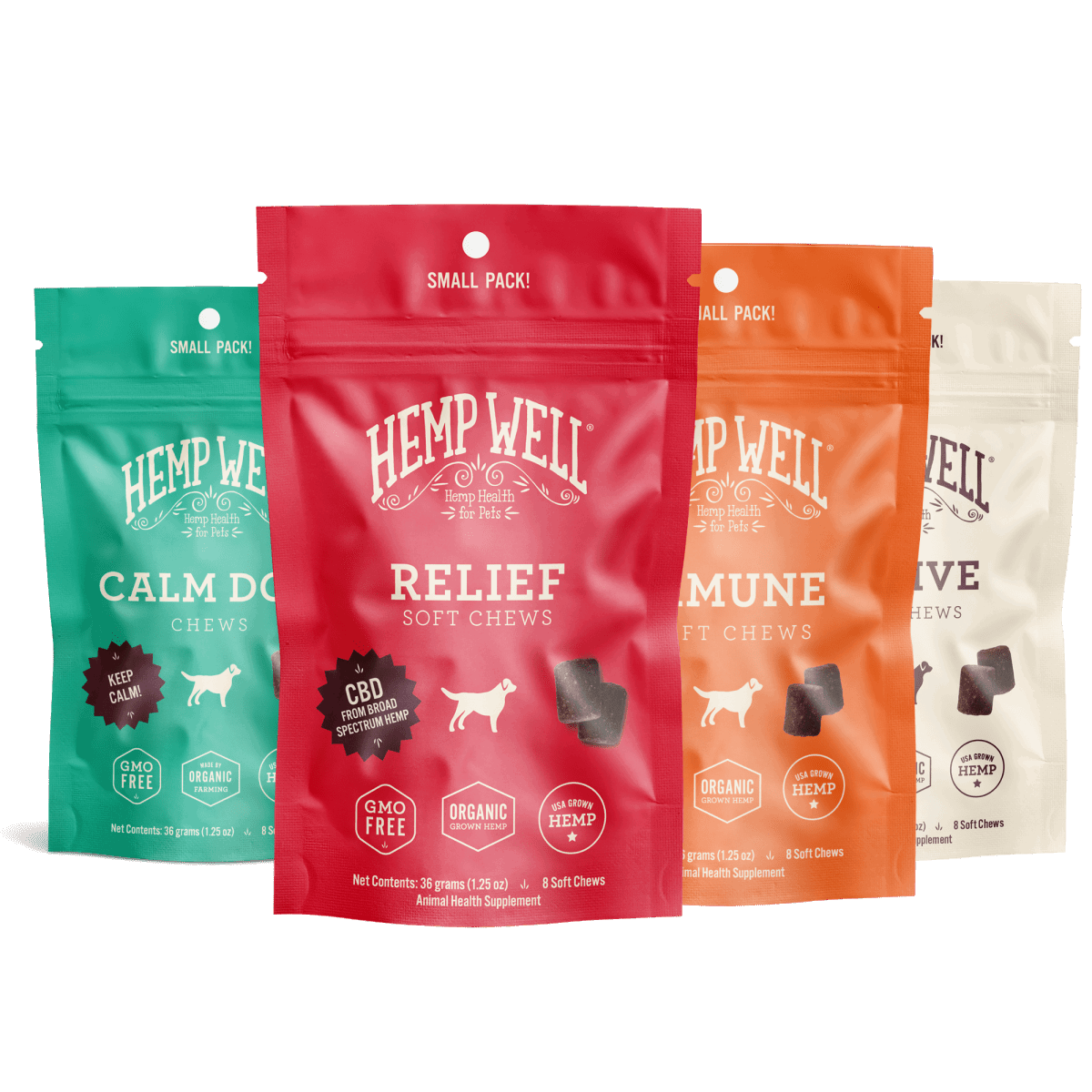 Some Hemp Well products contain naturally occurring CBD from hemp, while others use only nutrient-rich hemp seed oil. Each product label clearly states its ingredients so pet parents can choose what’s right for their pet’s needs. Our Relief line (the red label) typically will indicate CBD.