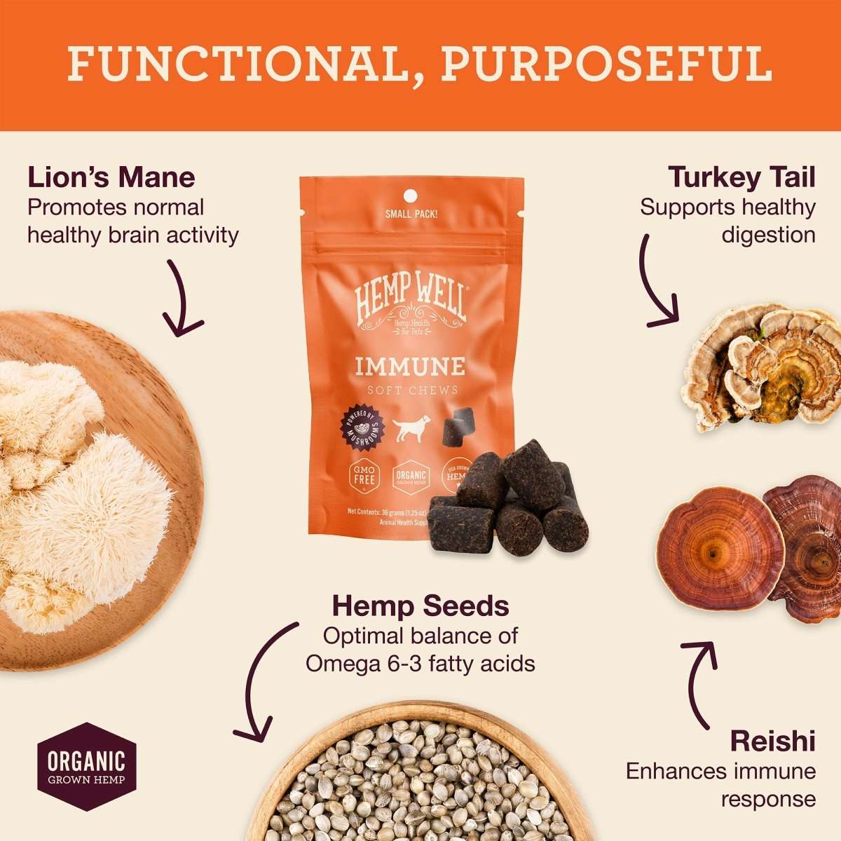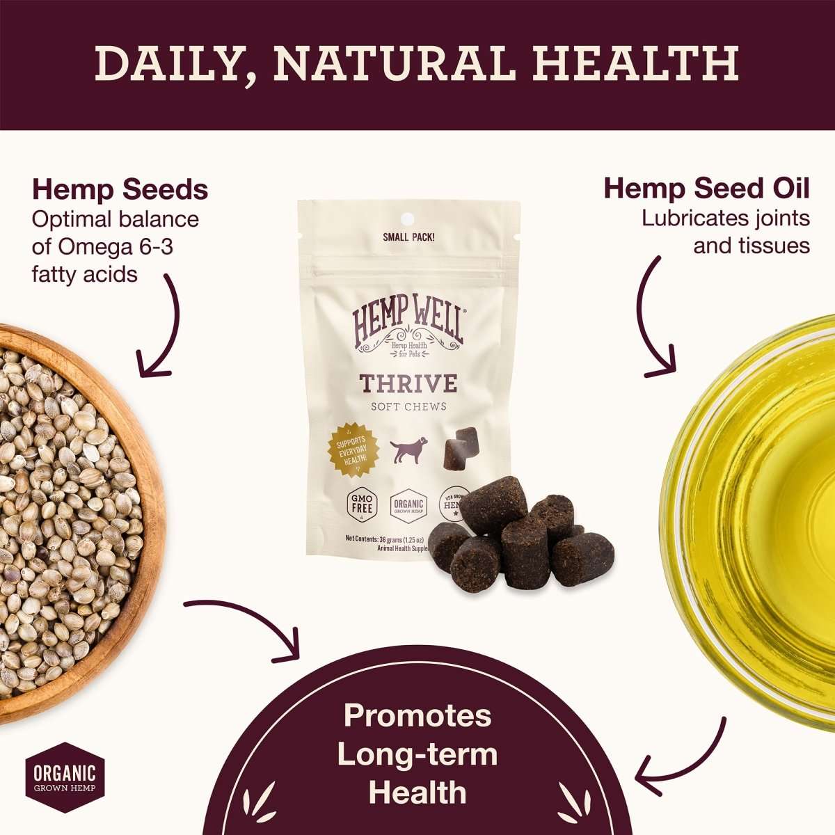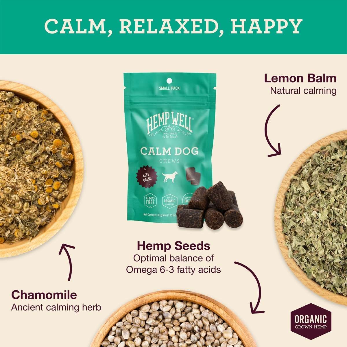 Some Hemp Well products contain naturally occurring CBD from hemp, while others use only nutrient-rich hemp seed oil. Each product label clearly states its ingredients so pet parents can choose what’s right for their pet’s needs. Our Relief line (the red label) typically will indicate CBD.